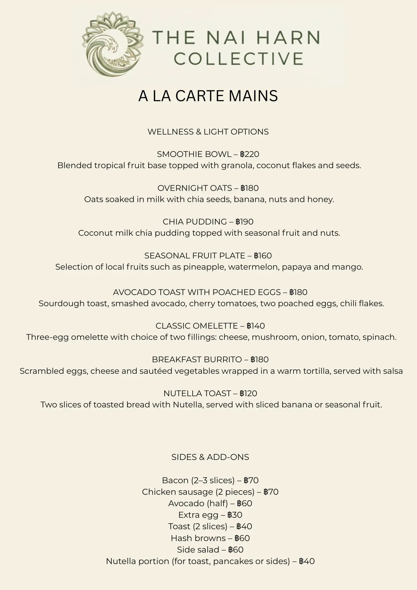 The Nai Harn Collective Breakfast menu page 1 - featuring gourmet dishes, beverages, and dining options at our boutique villa hotel in Phuket